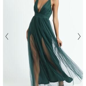 Showpo Women's Like a Vision Emerald Mesh High Slit Spaghetti Strap Gown Size 8