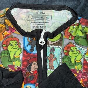 Fun Shrek character print one piece pajama. Ankle cuffs fold over for full foot coverage. Vivid green, red, blue and brown tones. Soft printed fabric with upper and lower zipper. Great for fans of the movie. Bright, playful design.