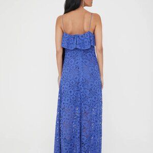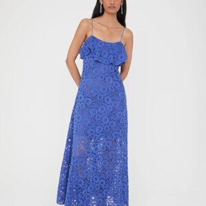 The Honor is a long cami dress, made from a blue floral embroidered fabric. Featuring spaghetti straps and frill detailing around the bust.Brand new, never used.