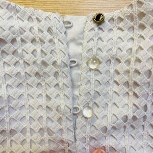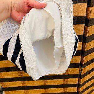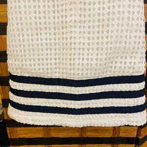 Shrinking Violet presents a Girls Size 4 Sleeveless Dress in white and navy blue. A fun eyelet overlay with a full lining, features a floral appliqué and blue stripes, perfect for summer and spring.