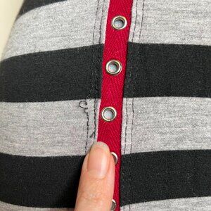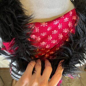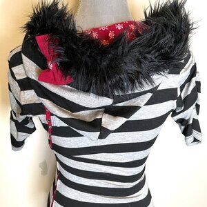 Y2k/early 2000's vintage! Rad black & gray stretchy striped knit cotton! Black monster fur hoodie is fully lined with red skull print and has a little bow on the side. Red eyelet tape accents were sewn under the fabric on front and back. Ruched sleeves and bust.