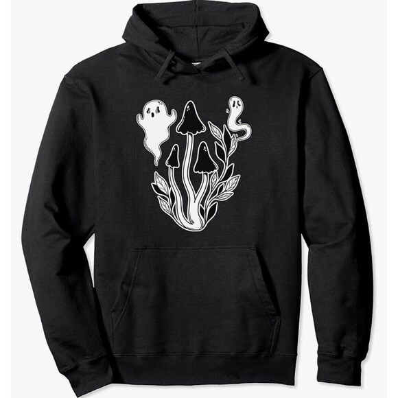 Black hoodie with white graphic of ghosts and shrooms! Super cool hooded sweatshirt. Has pocket in front. Size medium. unisex. Approximate measurements: 20" pit to pit, 25" length.