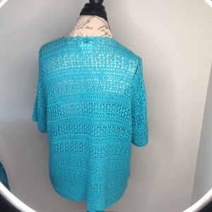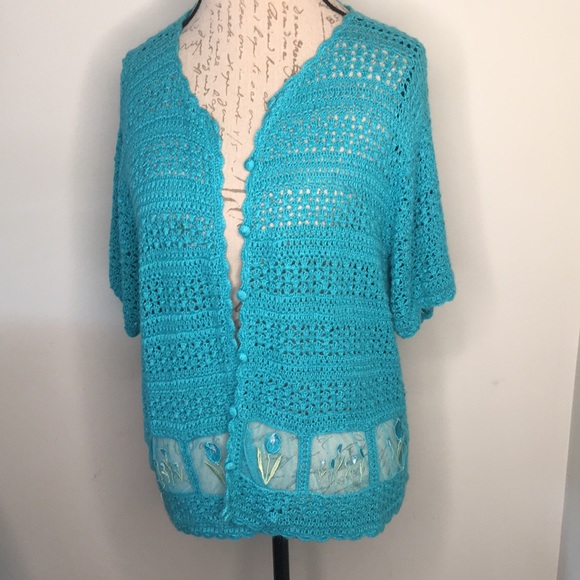 Turquoise shrug with cute detail. You can wear this over a SunDress, a cami a sleeveless dress. Can be dressed up or down. Would be sharp with White