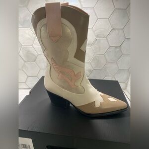 Chic camel boots with intricate embroidery. Perfect for versatile styling. Crafted by ShuShop.