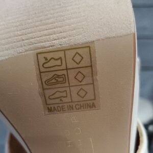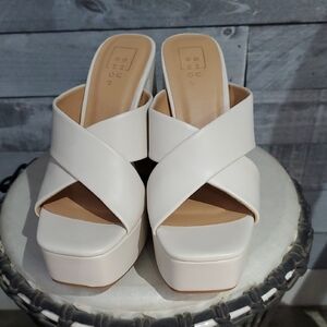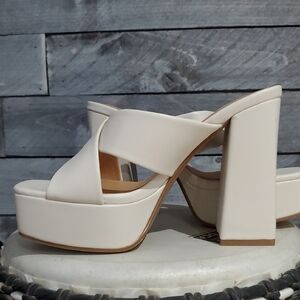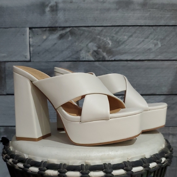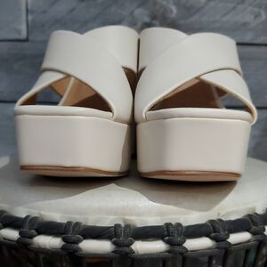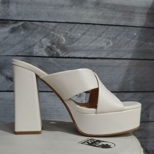 Elevate your style with ShuShop's cream platform sandals, featuring a chic slip-on design and a striking pearl embellishment around the midsole. The wide single strap offers a minimalist touch, while the thick platform sole provides both height and comfort. Perfect for adding a touch of elegance to any outfit. no flaws, new in box, Federica bone color