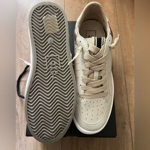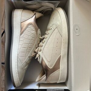 Stylish ShuShop kids sneakers. White body with tan accents. Comfortable and trendy.
