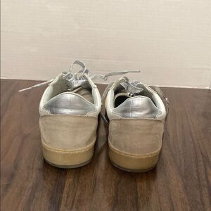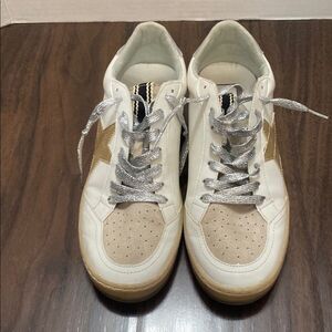 Chic ShuShop sneakers in cream and tan. Features gold, black and silver accents for a modern look. EUC