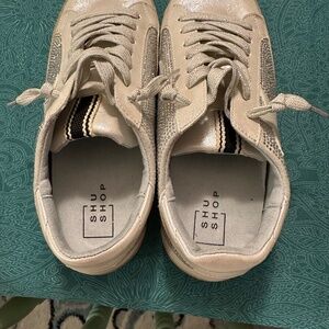 ShuShop size 8 super sparkly star sneakers. True to size. Shoes are an iridescent silver/cream color. Silver sparkly fast laces. Sides are covered in rhinestones.