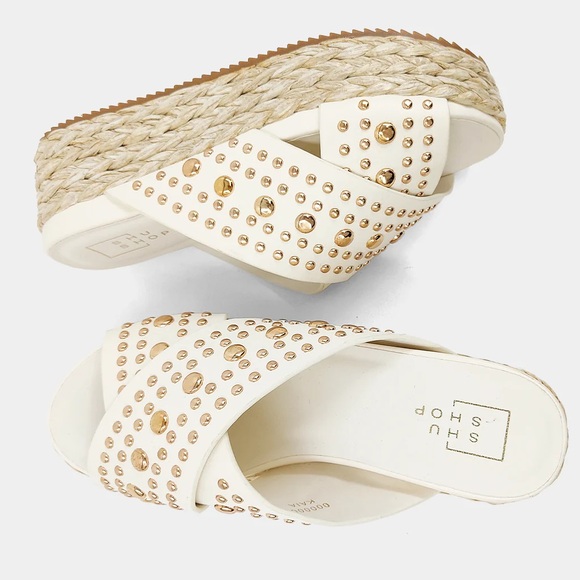 Chic ShuShop platform sandals with striking stud accents. Perfect blend of style and comfort. Brand new in box.