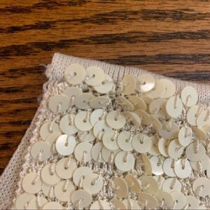 ShuShu sequined sleeveless silk blend knit top in size small. Light tan knit with creamy yellowish sequins on the front. Slightly sheer. A couple minor signs of wear, see pics, but nothing too noticeable without close examination. Photos are a part of the description. Color may vary with lighting or device.