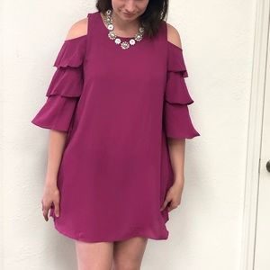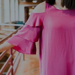 Cute magenta mini dress with cut out shoulders and ruffle sleeves.