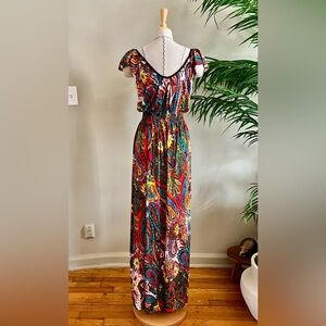 Gorgeous boho maxi dress by Shui Si Qing in size XL. Features a stunning multicolor paisley print with flutter sleeves, a scoop neckline, and an elastic waist for a flattering fit. The lightweight fabric drapes beautifully