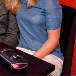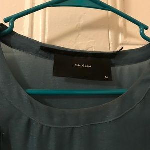 This is a beautiful blue-green dress from the designer Shulami, from a boutique in Boston. The material has a bit of sparkle to it, so I attached a photo to show the color in better light. The sleeves are short with layered fabric, and the bottom is baby pink rows and layers of ruffles. It’s very elegant, I bought it for a wedding party. In excellent condition, only worn a couple of times.
