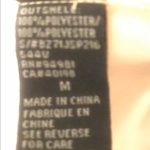 Marked as a size M but fits like a S. 100% polyester.