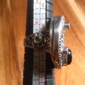 This unique, artisan crafted ring features all genuine, earth mined gemstones in a gorgeous ocean bloom design. It includes Shungite, blue topaz, chrome diopside, citrine, and garnet. It also has genuine mother of pearl as the backdrop. The ring is set in 925 sterling silver. Size 7. 1.90 ctw.