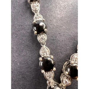 Black stones test as shungite , white accent stones test as topaz. Prong set in either platinum or rhodium plated over sterling silver. Measures 18-20 inches with chain extension. Measurement doesn’t include teardrop stone hanging off the middle lowest point. Spring ring clasp. 925 STS