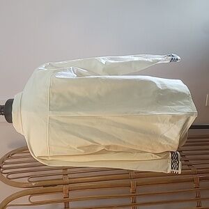 white linen like material (I can't read tag) with green and black embroidery geometric patterns
