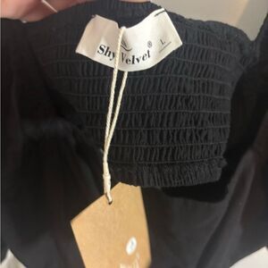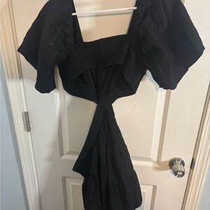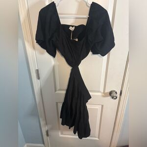 Chic black midi dress with square neckline. Features short sleeves and tiered skirt. Perfect for versatile styling. Shy Velvet Women's Summer Dress Square Neck Short Sleeves Crossover Waist size large NWT