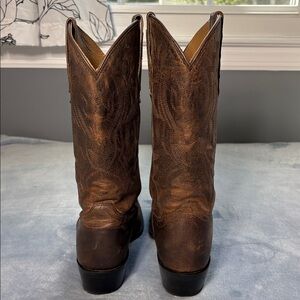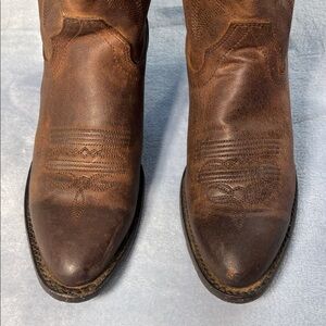Preloved good condition brown leather boots by Shyanne. 1.5" Block heel. Review photos carefully. These are preloved. Left boot shows a little more wear. Last 2 photos capture little lighter specks on it. Ask me any questions and make an offer!