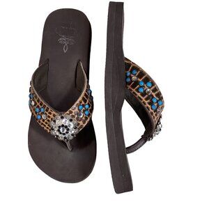 Description: Shyanne Rhinestone Beaded Cowgirl Chunky Flip Flops Animal Print Brown Turquoise Bling, Comfy.