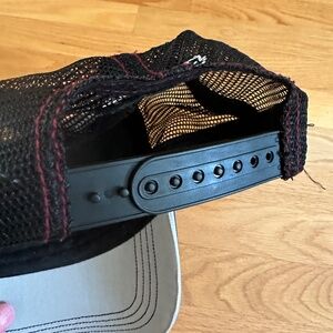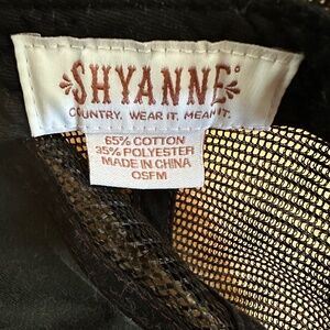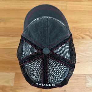 Shyanne Rodeo Cowgirl Trucker Hat Cap Black Gray Womens. Distressed look charcoal gray front and bill. White embroidered stars on each side of RODEO on the front. Black mesh except for front two panels. Shyanne embroidered above adjustable snap back. Red top stitching on bill and black mesh. Excellent, clean condition.