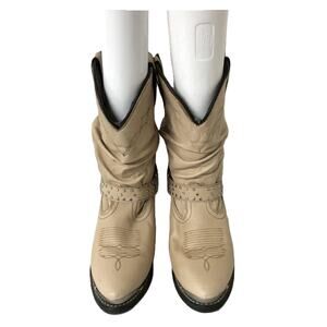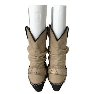 Preowned: Stylish, tan leather mid calf western boots with a slouchy shaft design / pointed toe / metal toe rand / silver tone hardware / studded harness strap accent / block heel / pull tabs / mesh lining / rubber outsole / contrast stitching by Shyanne.