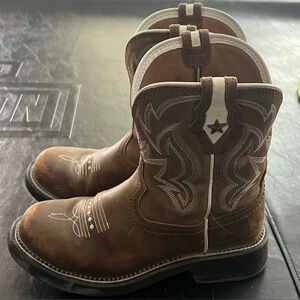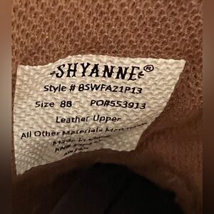This is a pair of Shyanne women’s cowboy boots. Mid calf rise. Size 8. Rubber soles for no slipping on floors. There are a few scuffs that shoe polish can fix. Very comfortable insole. I do not wear anymore and they just sit in my closet. Would like someone else to enjoy as much as I did.