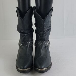Kick up you heels in these Shyanne Slouch Fashion Boots. These boots with have you walking in style with a 10' slouch shaft, studded harness strap and heel chain. The soft faux leather mesh lining and cushioned insole with keep you comfortable while you are tearing up the dance floor or strutting your stuff through town.