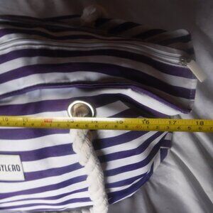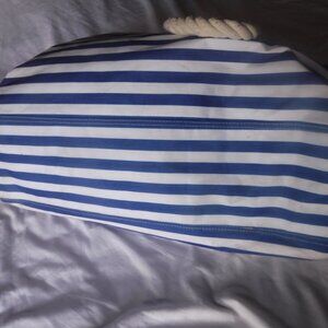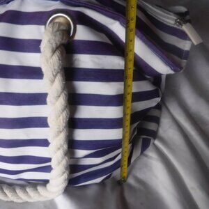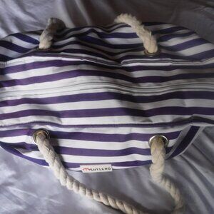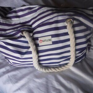 The Shylero Beach Bag and Pool Bag is a large XX-Large beach tote in navy blue with stripes, featuring a zippered closure and double beige handles. It is designed for travel and casual occasions, with a silver hardware accent and a key holder accessory. The lightweight canvas exterior, along with pockets for organization, make it a practical and stylish choice for anyone heading to the beach or pool in search of a comfortable and spacious bag.