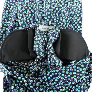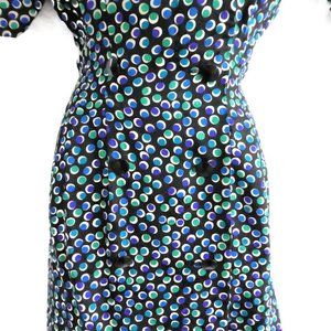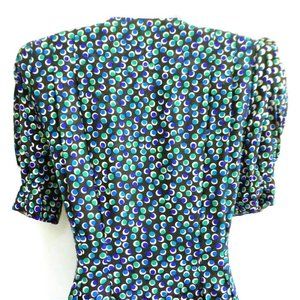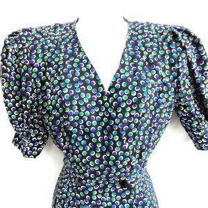 Vintage 80s does 30s 40s Style. Adrianna Papell Dress Pure Silk. Geometric Circle Dots. Wrap Double Breasted Button Front. Padded Shoulders. Short Puff Sleeves with Belted Cuff. Matching Fabric Belt. Made in Korea. Tagged Vintage Sizing 4. Measure US Size Small.