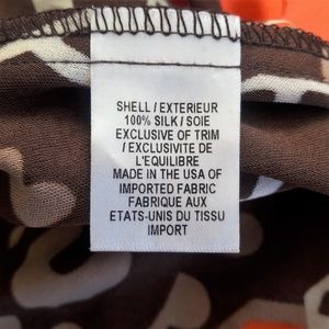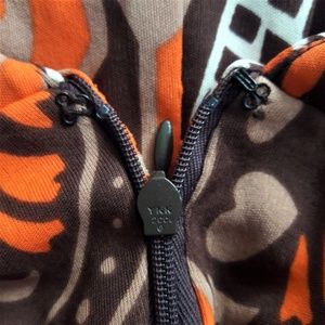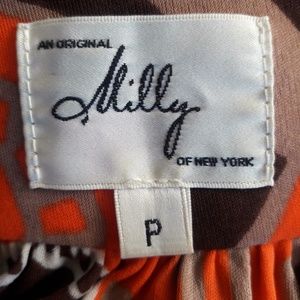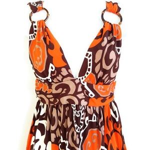 Milly of New York Sun Dress Fit & Flare. Plunging V Neckline. Backless. 100% Silk Knit. Stretch. Flattering Gathered Empire Waist. Side Ykk Zipper. Geometric Print. Orange, Black, Tan & White. Bamboo O Ring shoulder strap detail. Bare Back. Made in USA. Tagged size P.