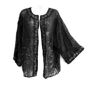 SiLK Rayon Metallic Blend Chicos Kimono Jacket Sheer Lame Black Floral 2 L 12