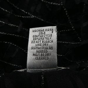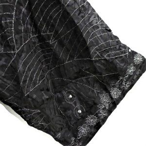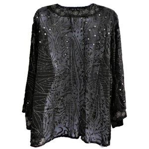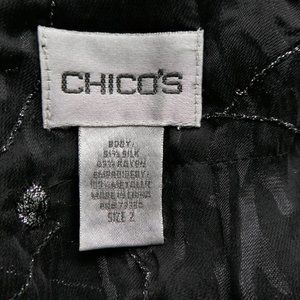 Chico's Jacket Open Front Sheer Silk / Rayon Blend Lame. Silver Metallic Embroidery Flowers and Butterflies. Black Kimono Sleeves. Machine Wash. Tagged Size 2. US Size L / 12