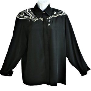 Vintage 80s SiLK Western Black Blouse Hidden Button Panel. Shoulder Pads. Bling Rhinestones Beads Sequin Embroidery. Measures Modern US Size Large L.