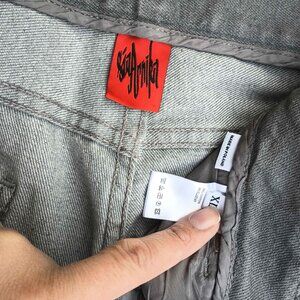 Size XL indie designer jeans with gothy print designs! Mint condition, lightly worn.