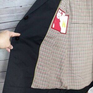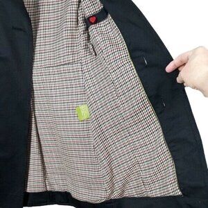 Söia & Kyo black convertible collar belted lined trench coat. Double breasted closure. Oversized buttons, square buckle. Back buttoned yoke. Pleated at the cuff. Button-tab pockets. Optional collar strap. Water-resistant. Houndstooth pattern. Inside pocket. Excellent pre-owned condition with no stains or tears.