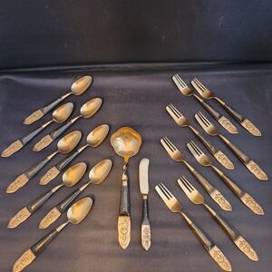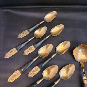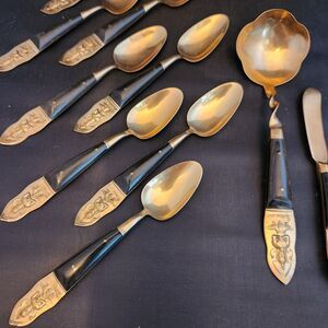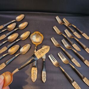 Hard to find complete 18 piece dessert set of Buddha brass/bronze flatware made in the 1950s. Service for 8 includes a serving ladle and spreader. Great gift & a fun conversation piece! Handles are wood, usually teak.