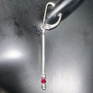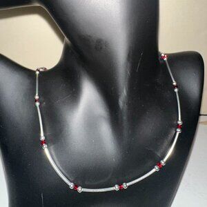 A 23" chain necklace of siam-color Svarovski crystals and silver-plated beads. Earrings are sterling silver teardrop earwires. This is a handmade one-of-a-kind set.