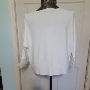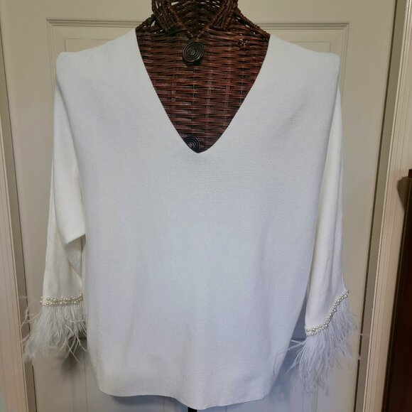 Siani Milano White Tunic-Style Sweater Top-Feathers & Pearl Sleeves (Large)