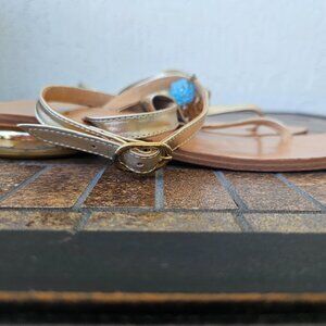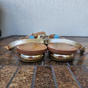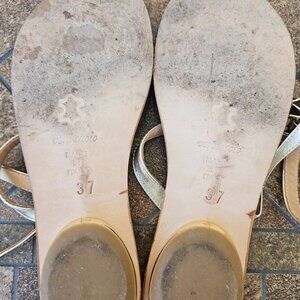 These sandals were bought in Italy and worn only a few times. There is normal wear on the soles of both shoes but are otherwise in very good condition. The US size is equivalent to a 6.5/7. Both shoes have cute dangling little crystal balls. The heels measure 1 inch high. Sold as is, no returns accepted.