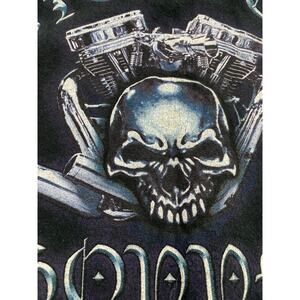 Sick Boy Choppers short sleeve tee in size Large. Black shirt with bold front and back skull graphics and metallic-style lettering. Printed on Fruit of the Loom Heavy Cotton. Classic biker aesthetic with vintage edge.