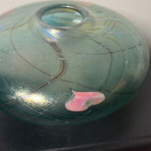 Siddy Langley Iridescent Hanging Hearts 1985 Aqua Blue & Pink Oval Glass Vase