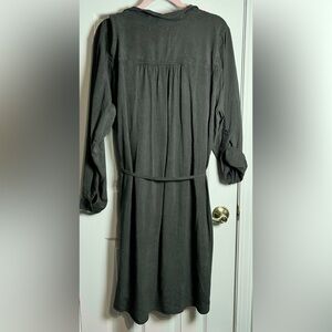 This Women’s Button Up Charcoal Dress is a XL. It is from the Side Stitch Los Angeles Collection. It has long sleeves with roll tabs. In the pictures I have one side rolled and the other sleeve down. This dress also has a thin belt at the waist made out of the same material as the dress. This dress also has pockets. It is made of 100% Lyocell and Machine Washable.