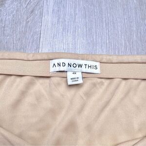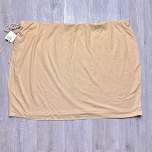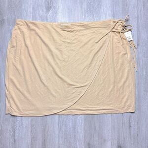 Size 4X tan color mini skirt. Faux wrap style. Two ties at the side. Elastic waist. Lined inside. New with tags. Waist 23in. Length 20in.