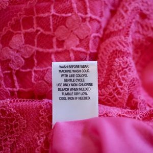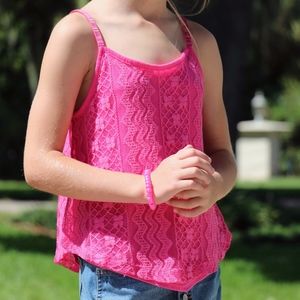 This bright pink lace tank top has a bit of an a-line shape with a hem that is higher on the sides and comes to a point in the middle of the front and back.