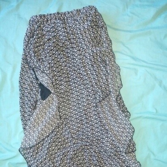 Patterned maxi skirt with a black short skirt under and sheer material all the way down. Has slits in the sides. Picture doesn't do this one justice, it's very cute on!