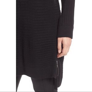 Sleek ribbing lends dimensional texture to a tunic-length sweater styled with relaxed dolman sleeves and edgy side-zip details. Mix and match this versatile style throughout the season for a variety of cozy looks.