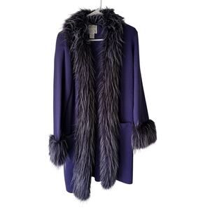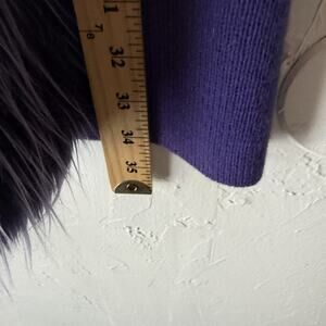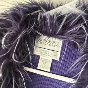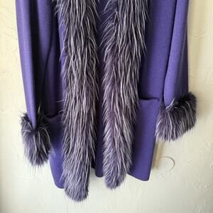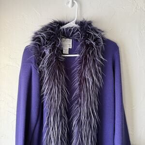 Color: Deep purple cardigan sweater with dramatic matching purple/gray faux fur trim