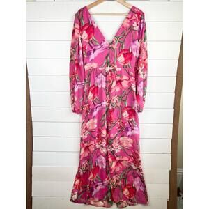 Siena Pink Floral Print V Neck Long Sleeve Empire Waist Maxi Cutout Dress Sz 14