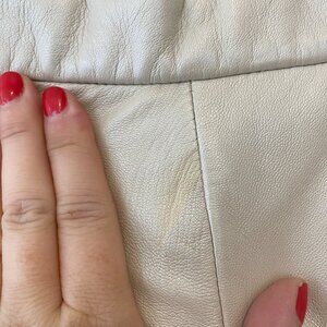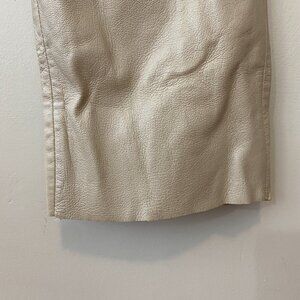 Straight leg leather pants in a pealescent ivory color. Bottom edges are raw and can be hemmed at any length. One spot at back center